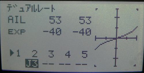 |  | ヂュアルレートやエクスポの数値もFF9と同じに設定します。エルロンはスナップロールの時に舵角が大きくなるように設定します。エレベーターを大きく打った時に効くようにしますので、スイッチ選択で−−のところを選択して。 |