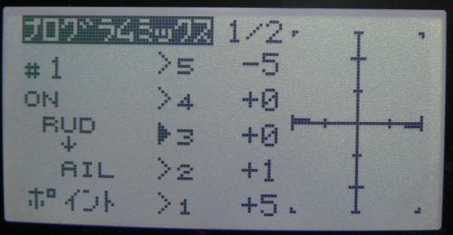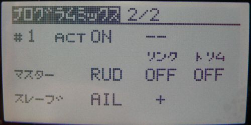 |  | 他にプログラムミキシングの数値も同じように移します。 しかしこれだけでは右側のエルロンは動くのに左側が動きません。 |
