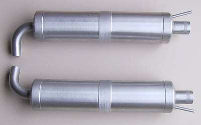 静かでパワーが出るとの噂のキャニスターマフラー 2本で 442g 中央の最大径60mm 右側の入り口側は 25mmΦ で2mm厚ぐらい 出口は 18mmΦ で1mm厚ぐらい 本体の左右と中央の厚く見える部分を残して軽量化のため削り込んであるようです 入り口側のパイプは本体の3分の2ぐらいまで突っ込んであり、その後ろにバッフル板があるようで排気側から棒を入れてみても入り口側からは見ることが出来ません、文字での説明はこれ以上できません。 |