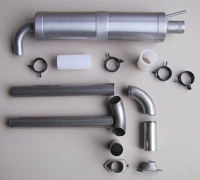 他のパーツはこんなもの パイプは0.3mm厚のステンレス 片方が絞り込んであって、はめ込んで溶接しなくてはいけません 各自機体に合わせて切ったり張ったりの世界です。 基本的にグローの2サイクルのチューンドパイプと同じです。 マフラー本体は別で左右セットで 368g |