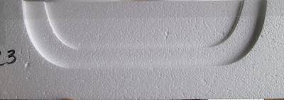 上写真後方の箱の中身 主翼の発泡スチロールコア 穴が開いているのはサーボ用のものではなくて、かんざしパイプの穴を開けるための主翼中側の切り欠き、またかんざし受けを接着する場所です。 発泡スチロールコア 左右で 700g 比重は 0.016g/cm3 前後で 60倍発泡と呼のでしょうか? 発泡スチロールのメス型はプランク、サンディング、穴あけなどの時に使うので最後まで捨てないようにとの注意を頂きました |