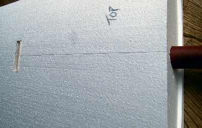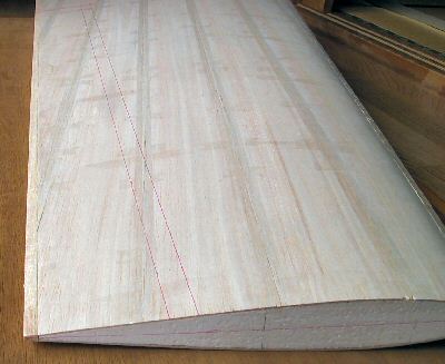 |  | G−3 カットラインに定規を当ててカッターで正確に切ります、やや山形になるように。この後#120のサンドペーペーでスチロールだけを削り落とします。軽い力でサッサとやると思いの他いに簡単で綺麗に仕上がりました。ポイントはバルサを削らないで済む様に真っ直ぐなラインを出して正確に切ることです。 |