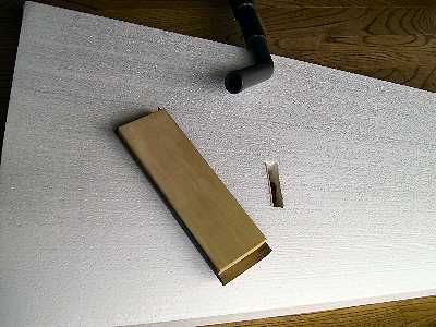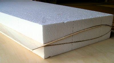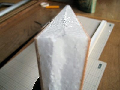 |  | D スチロールコアのサンディングをします。すべすべにする必要はありません。高めの所をすり落とす程度で充分。私は#240番でざっとやりました。その後しっかりほこりを吸い取ることが重要です。コア、ネガティブコアとも左右上下が入れ替わらないよう、最初に梱包してあった組み合わせで取り扱うことが重要です。 |