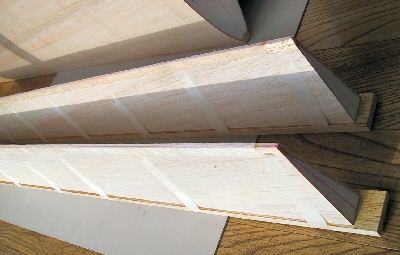 |  | H エルロンヒンジライの前後縁材を 9.5*101.6*1219.2 バルサ材から大きめに切り出しプロボンドで接着します。特にエルロン側は反らないように注意が必要です。ボンドが乾いてからプランク材と面一になようトリミングします。 |