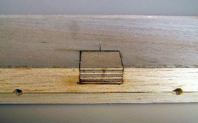 |  | I−2 コントロールホーン台 9.5*25.4*25.4 の合板を取り付けます。合板をガイドにしてカッターで切り込みを入れ切り取りサンドペーパーで仕上げますが現物合わせで手間がかかりました。やや隙間が出来たのでエポキシ+マイクロバルーンで接着材をたっぷり塗ってドライヤーで暖めながら台が面一になるまで押し込みはみ出した接着剤は綺麗にふき取ります。 |