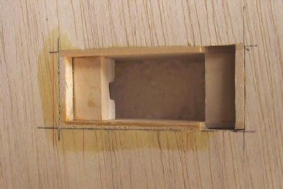 |  | I−3 サーボの取り付けは 3mmバルサで箱を作って埋め込みました。底板はありませんサーボ取り付け材はシナの棒材から切り出しです。取り付け材は箱にいも付けにしないで、箱の方を切り欠いて差し込むようにしてさらにバルサの補強材を接着しました。プランク材の上に箱を載せてガイドにしてカッターで切り込み中をほじくり出します。隙間があるところはプロボンドをたっぷり塗って充填効果があるようにしてサーボボックスを埋め込みます。 サーボコードを通す穴ですが主翼の上面側に開けた方が取り回しがしやすいようです。 |