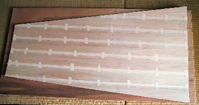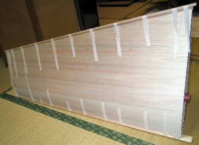 |  | E いよいよプランクです。説明書に書いてあるようにバルサを繋ぎます。私は付き合わせのラインの加工はしませんでした。というかやってみたけど上手くいかないので諦めた。繋ぎ目を寄せるようにマスキングテープで引っ張た後繋ぎ目をマスキングします。この後コアに挟んで周囲を1cmほど残して切り取ると良いでしょ、プランク材のあまりを他で使うようになるので少し残しておきます。 |
