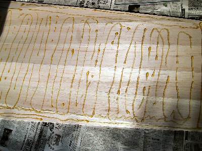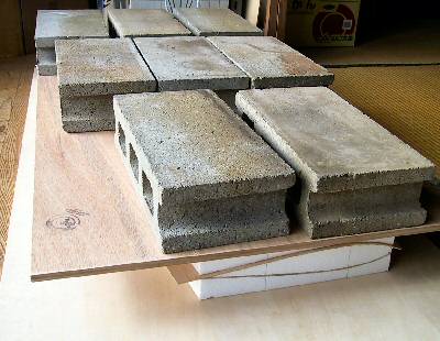 |  | E−4 重石になにを使うかは考えもんです。私はたまたま庭の隅にブロックがあるのを見つけ重さを計ったら10cm幅の物が約10kgでした。ブロックは10個有ったのですが載せてみると8個で丁度でした。小西さんの話しでは重石をのけた時コアが伸びてクシャと音がするぐらいがいいとか、80kgでは少し軽いように思いました。立てて置けば10個は置けたと思います。正月休みに縁側でプランクしましたが一晩で固まっていました、夜間の気温は5℃ぐらいでしょうか。プランクが終わったらコアと面一になるようにしっかりサンディングします。ものぐさな私はカッターで荒削りをして#120番で仕上げます。 |
