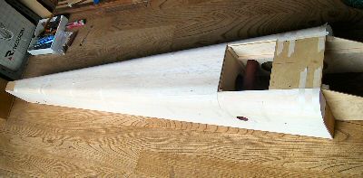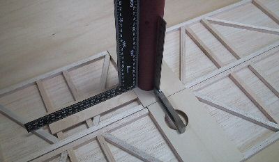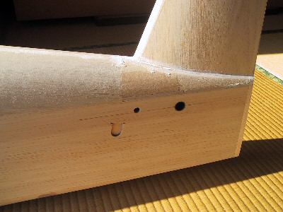 21 胴体にソケットを合わせます。ウイングチューブを入れて左右主翼を取り付けてみます。主翼のアライメントが良くて胴体との取り付け面がピッタリ合うように調整します。問題ないようなら胴体にソケットを瞬間で(隙間があればバルサの粉やマイクロバルーンを盛っておきます)、主翼のルートリブをプロボンドで主翼に接着します。(私の場合アライメントは問題なかったですが、胴体との取り付け面が最大2mmぐらいの隙間がありました。ルートリブを接着した後さらにスクラプバルサを貼ったりサンディングして隙間がなくなるように調整しました) 22ーA 図面を参考に胴体上辺から測って主翼の取り付け中心線を書きます、また取り付けビスの位置に6mmほどの穴を開けます。 22−B 主翼を取り付けます。主翼の前後縁の中心線と側板の取り付け中心線が合えばOKです。胴体の内側から6mm穴の位置を主翼ルートリブに印ます。 |