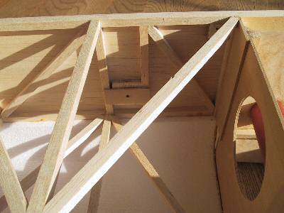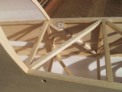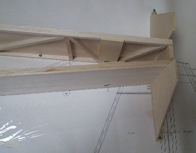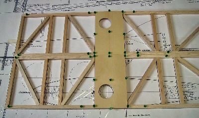 19 機体上面側から 9.5mm角のバルサ材から切り出してトラス組みをしていきます。ボトムデッキを載せてあわせてみます。 |