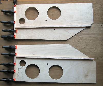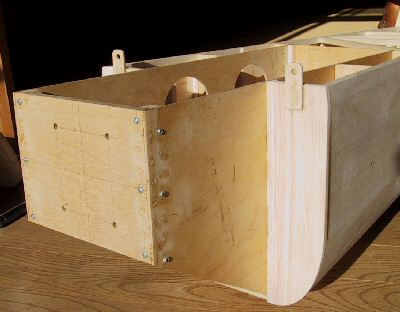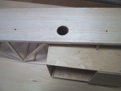13 側板に軽量化のための穴を開けます。切り抜いたベニヤ板はエンジン取り付けの時かさ上げ材に使えますので保存しておきましょう。キャニスターマフラーを使うので下側の穴は開けません。側板後方に接着補強材として、マフラー室の仕切り取り付け用として 9.5mm角のバルサを切り出して接着。 |