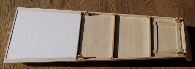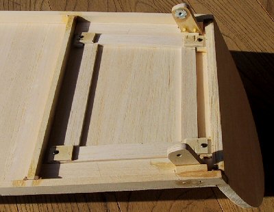 22−E 主翼を取り付け片方のウイングパットを接着剤を付けずに仮付けし主翼のアライメントを確定します。もう片側にエポキシを塗って胴体に接着します。固まったら先に仮付けした方を本接着します。 22−F 3.1*38.1*38.1mmバルサ材を切り出し胴体のウングパッドに貼り付けます。その上に 3.1*25.4*66.6mmベニヤカバープレートを貼ります。応力を分散するためにカバープレートは 3.1バルサ材と 9.5mm角垂直トラス材の双方が面一になって接着していることが重要です。 |