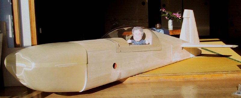 24 リヤボトムデッキを取り付けます。これはほとんど修正無しで大丈夫です。モーターボックスのサイド材は修正が必要でしょう。ボトムデッキ後部はスチロールコアで作りますが胴体との間に 1.5mmバルサの下駄を履かせてあらかたラインが出るようにサンディングした後、横に 3mmずらして反対側をサンディングします。3M−77スプレーのりでプランクします。下駄をのけて取り付けるとほぼラインは合うでしょう。 側面図と上面図では側板の実際の長さが違うので F−2の前に 6.3mmバルサを貼って調整します。 モーターボックスの底に 6.3mmバルサを貼りますが、私はマフラーの取り付けが終わってからにします。 |