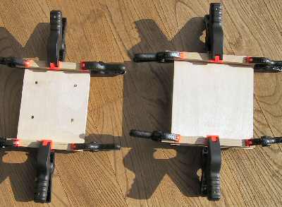 13 色々なジグを駆使してエポキシ接着剤で組み立てます。かなり堅い側板が微妙に反っていて全ての面が直角とは言い切れないが、こんなもんかと納得してしまった。 15 ソケットを仮に入れてみて全てが直角に出来ているか確認します。側板に微妙な歪みはありますがほぼ完璧にアライメントは出ていました。 |