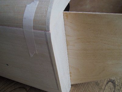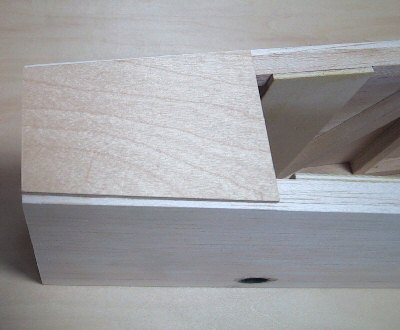 16 側板の前後の端を図面を参考に斜めにサンディングします。 モーターボックスと側板を上面が図面の上になるようにおいてみます。 17 F−5の両側をサンディングして側板と角度を合わせて瞬間で接着。 |