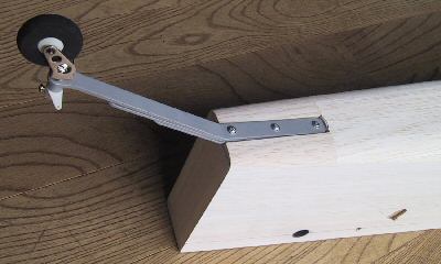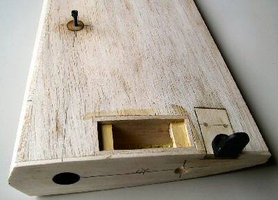 23 チューブを差し込んで水平安定版を取り付けアライメントを出します。Lブラケットの形を側板に書きます。側板を切り取り胴体内側にLブラッケト受けの 9.5*25.4*57.1mmのベニヤをエポキシで接着。Lブラケットは胴体には 3*20mmタッピングビスで取り付けます。水平尾翼を取り外す時は尾翼側の3mmビスを外すようになります。 |