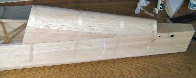 26−A 前方に 6.3mm 後方と下側に 1.5mmバルサを貼ってハッチを整形します。 ハッチをテープで胴体に仮付けします。バルサ側板を整形してハッチに合わせます。 |