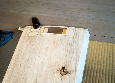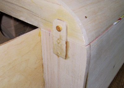 26−G 6.3mmダウエルをハッチの前面に埋め込みます。3.1*22.2*609.6mmベニヤからフロントハッチ固定材を切り出します。6.3mm穴を開けて固定材をエポキシで胴体に接着。後でノックピンを打っておきます。 |