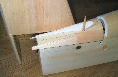 27 垂直安定版のアンカー棒を接着します。フェアリングを胴体ラインと合うように整形します。バルサを張り増したりサンディングして形になりました。図面の切り取り線を写してフェアリングを削りますが、図面の線は安定板の後援材の部分も含んでいますのでその分を引いてフェアリングに写して下さい。現物合わせでしっかり整形した後、安定版、フェアリングをプロボンドで接着。 |