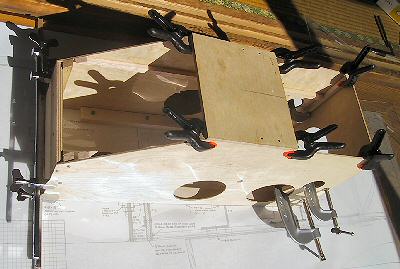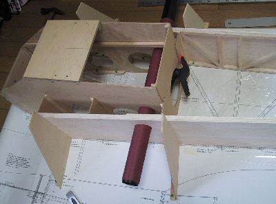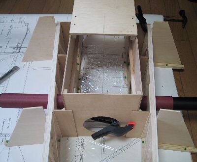 19 機体下面側のトラス組みをします。側板が真っ直ぐで定板に直角になっていることを確認。大変重要ですのでしっかりチェックのこと。 |