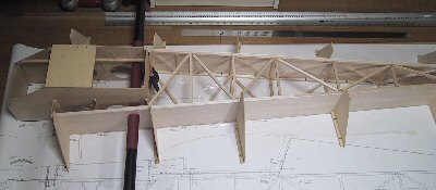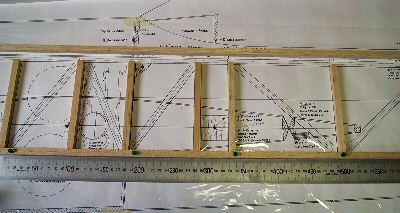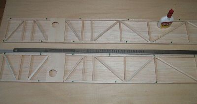 16 胴体トラス組みです。側面図のBIGIN TRUSS SIDE HERE の矢印の箇所を先頭に合わせます。縦通材は斜めに削いでから繋ぎましたが、真っ直ぐで面どうしをぴったり合わせるのは難しいです、最後はバルサの粉と瞬間攻撃。垂直材はカットしてあるので問題無いですが、斜め材も最後はバルサの粉と瞬間で隙間をつぶします。斜め材を少し無理をして押し込むとピンを外した時に歪むので注意してください。組み立てには全て瞬間接着剤です。写真では下側に定規を当てていますが、組み立てでは上の辺が基準になりますので,上側の縦通材に定規を当てて真っ直ぐにしてください。出来上がりましたら両面を軽くサンディングしておきます。 |