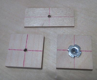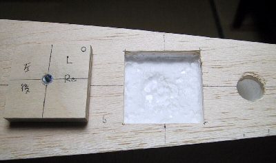 22ーC 6.3*38.1*38.1mmプライウイングマウントパッドに4mm爪つきナットが入るように穴を開けて取り付けます。 主翼ルートリブに書いた6mm穴の中心とウイングマウントパッドの中心が合うようにしパッドが埋め込めるようにルートリブを削ります。 |