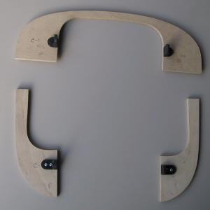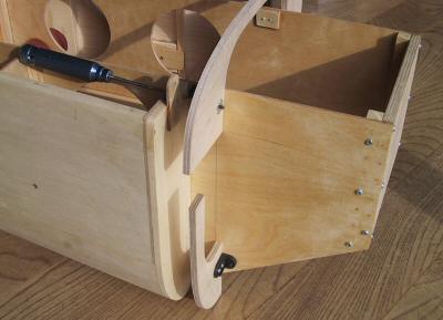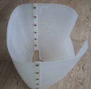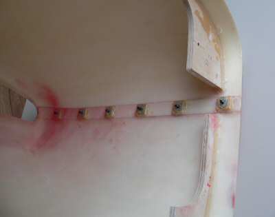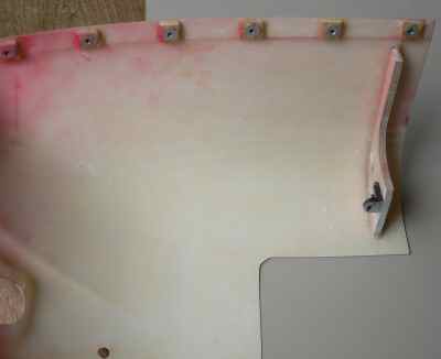 3.1*19*610mmベニヤ板から適当な長さに12枚の裏当て材を切り出します。私はここだけはインチサイズの 6−32 ボタンヘッドスクリューと爪付きナットそれにナイロンワッシャーを使いました。上下カウルをテープで確実に固定してから一ヶ所づつ固定していきましょう。 |