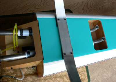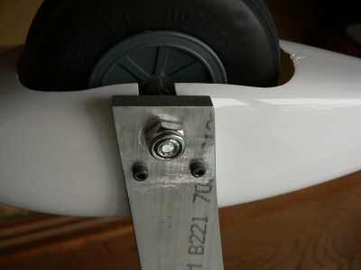 30 ギヤの取り付け 3.1*31*76のベニヤ板をスパッツの裏側に補強用に接着します。タイヤはアクスルシャフトで取り付けます。スパッツはギヤから補強ベニヤ板までドリルで貫通させ3mmビス2本とナイロンナットでで取り付けました。 |