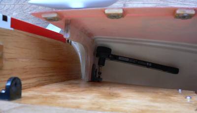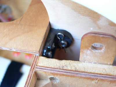 カーデンノ機体は脚の取り付けはシンプルです。6.3mmのベニヤ底板と12mm角の強化材にタップを切って左右合計4本の5mmビスで取り付けるだけです。 |