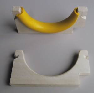 エンジンマウント用の棒材を上手く切るのは大変です。小西さんに相談したら写真のようなプレートを送ってきました。ジュラ材で2.5度分クサビ状に加工してあります。このほかにも色々あるようです、エンジンのマウントに困ったら相談してみてください。 |
