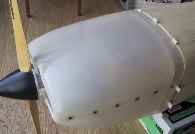 エンジンやプロペラの位置がカウルと合っていることを確認します。私はカウルと胴体が擦れないように間にバルサ板を挟んで少し隙間が出来るようにしました。胴体のラインとカウルがなじむように必要ならカウルリンクをサンディングします。テープでしっかり固定したらカウルリンクとカウルを瞬間接着剤で固定します(エンジンを外して前方や下面の開口部から手を入れてください)。隙間がある場合はマイクロバルーンなどを併用します。 |