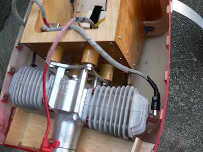 モーターボックスの前部三分の一は3mmベニヤ板を接着してエンコンサーボとイグニッション用バッテリーを乗せています。後部三分の二は3mmバルサです。マフラー室と仕切るようにしてビス止めにしマフラーのメンテナンスが出来るようにしておきます。 |