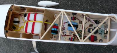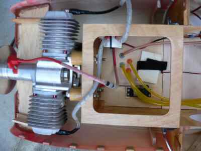 メカ配置 タンクはガソリンが32オンス、スモークが24オンスでウイングチューブの上に台を作り乗せています。丁度収まるようにボックスが設計されているそうです。メカ類は後方に3mmベニヤ板で台を作りバルサトラス材の上に接着しました。 |