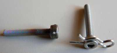 飛ばし始めると上部カウルの右側のビスがすぐ緩んでしまいました。ボンドG17を塗ってみたり、ロックタイトを塗ってみたりしましたが効き目がほとんどありませんでした。友人にビスの頭に穴を開けて割りピンを刺したらどうかとのアイデをもらいました。バイスで挟んでボール盤で1mmの錐をで穴を開けました。十文字に開けましたが、思いのほか簡単に開けることが出来ました。ホームセンターで手に入れた割りピンがぴったり合います。 |
