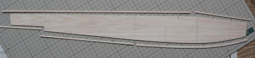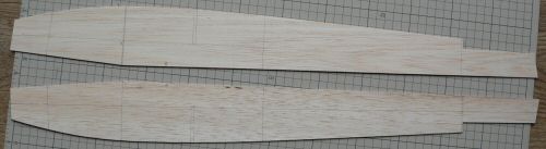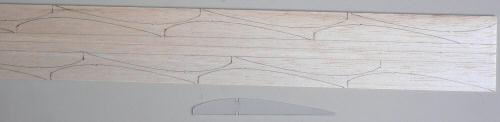 プランク材は75%なら1.5mmになりますが、手持ちの1mm材が余っていて重さも1.5mmより少し軽いので使うことにしました。下面のプランク材は前部が50mm幅で後部が15mm幅。リブ位置を書き込みます。中央が25mmで他は53mm均一です。 ☆ |