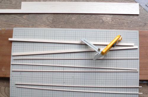 け引きカッターを使って棒材を切り出します。3mmバルサからスパーは3*3、前縁材は3*12で切ります。長さは450mmあればいいのですが切り初めと終わりでどうしても歪んでしまうので600mmの長めの物から切りだしたほうがいいものが出来ます。 ☆☆☆☆ |