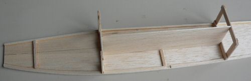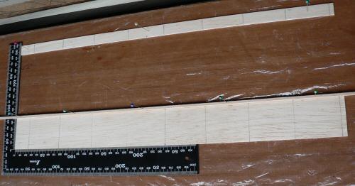 プランク材にスパーを乗せ直線を出したら待針で止めて瞬間を流し固定します。後部プランク材も位置を決めて待針で止めます。 ☆☆ |