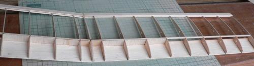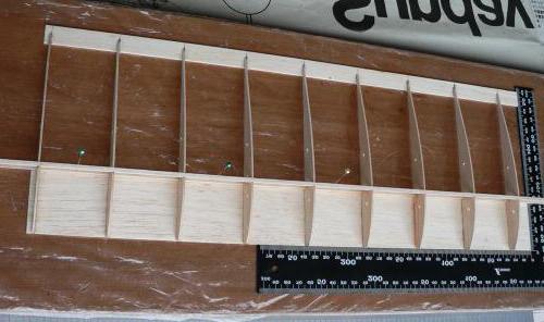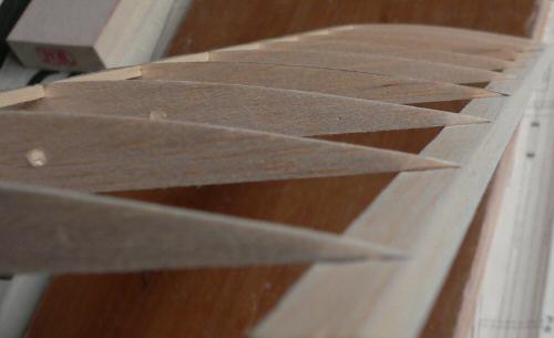 リブを線に合わせ台と直角になるようにしながら接着していきます。上部スパーもリブ上面と面一になるように埋め込み接着します。スパーとリブ面がそろうように気をつけ必要なら微調整します。 ☆☆☆☆ |