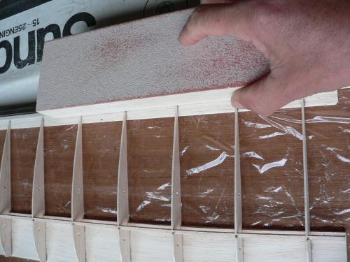 中央部の上下面をプランクします。プランク材の前縁部分をリブの前部と面一になるようにサンディングして前縁材を接着します。 ☆☆☆ |