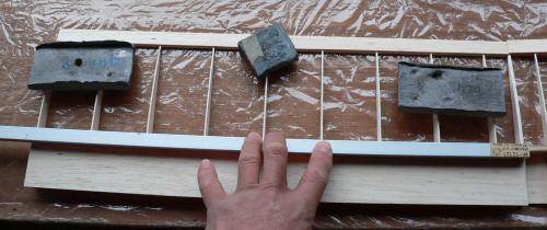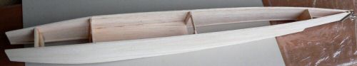 前面上部のプランクです。私は今回ジェリータイプの高粘度瞬間接着剤を使いました。スパーとリブに塗ったら位置を合わせてスパーの上に置きます、アングル材でスパー部分を押さえて接着させます。その後アングルを前にゆっくりと動かしてリブを接着していきます。 ☆☆☆☆ |