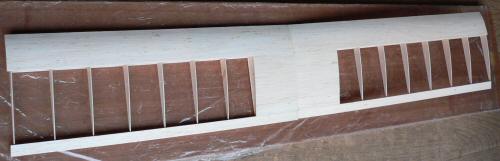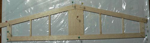 上反角分上部スパーを擦り合わせます。かんざしでスパーを挟んで角度が合っていれば接着します。3スパン分桁間補強材を入れます。中央リブは2枚を貼り合せてからスパー部分を切り取り接着します。上面後部プランクをします。 ☆☆☆ |