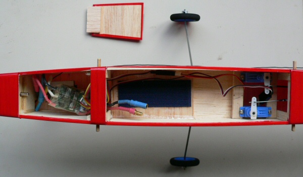 2サーボなのでメカ積みは簡単です。気になった重心位置はバッテリーを前気味にしてほぼ合いました。モーターの変更で機首を4mmほど切り取りました。 |