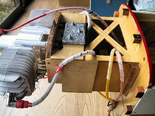 モーターボックスは思い切って防火壁の後ろ3cmぐらいで切り落とした。(側板ベニアのひび割れとかがないあたりまで)今度は防火壁が3cmほど前に出るように側板を伸ばしてどん付けで付けて、外側に補強板を貼り付けた。防火壁もホビーセイバーで仕入れていた、あちら製の堅い専用ベニア板から切り出した。仕上げに沢山の竹釘を打っておいた。 エンジンを3cm前に出しても200gの重りを積んでいる。失速系のアクロのやりやすさより着陸のやりやすさを重視した重心位置にしています。腕を上げたらもう少し重心を後ろにしてみたいものだ。 アンプとバッテリーの接続ですが中間コードにアンプ付属のコネクターを付けておくと、スイッチやアンプの取替えもすぐに出来るのでこの方法を薦められた、目からうろこのアイデアだと思ったのは私だけ? |