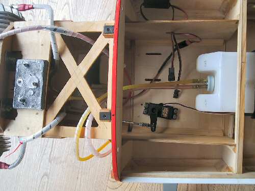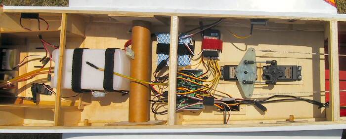 | 現在の胴体内部の様子 2004エアキラースプリングカップの後ラダーサーボを2個にした、何気なしに繋いでみたら上手い具合にサーボが逆転するので助かった(トーちゃんに感謝、サーボを平行にしたら困るとこだった) |