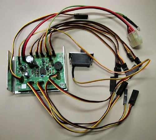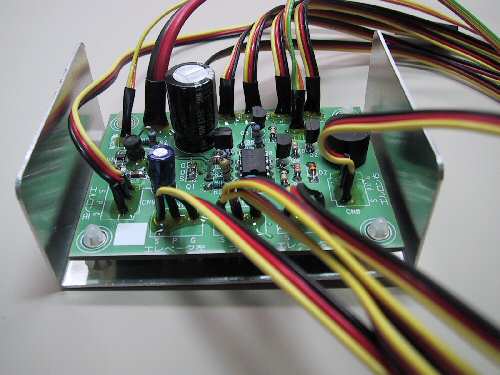 これは愛媛の トーちゃん 製作の電源装置 受信機からは信号だけを取り込み電圧を安定化してサーボに送る仕組みらしい? 右上側4本のコードを受信機に繋ぐ、エルロン1、エルロン2、エレベーター、らだー。下側のコードはサーボに、左エルロン、エレベーター、ラダーは2本ある、エレベーター右、エルロン右。 エンコンは受信機から直接取る、それからスモーク用にもう1チャンネルあってもいいと思う |