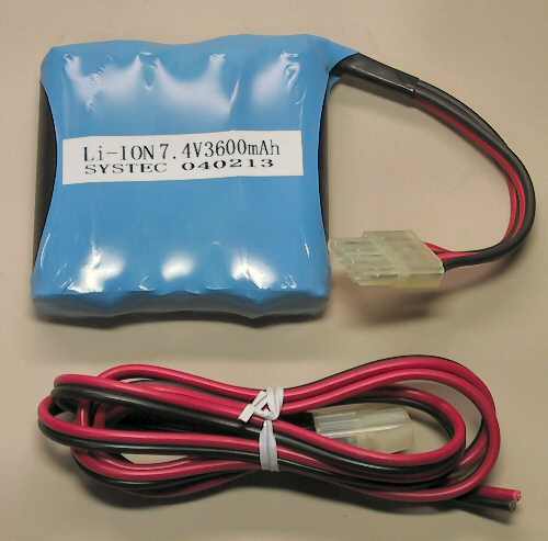 電池はリチュウムイオンの3600mAの2セルで7.4V 重さは196g 下は充電用のコード エッジは9サーボ使っているが1フライト約10分で250〜300mAを使う、 |
