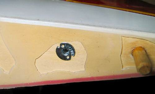 穴を広げて締め込むだけ、上手い具合にシリコン処理をしていたのでフランジの厚みも関係なし。適当な長さの4mmビスに蝶ナットを接着しておけば手で締めるだけでいいので楽だ。6フライトしたが緩むこともなく主翼もびくともしない。 |