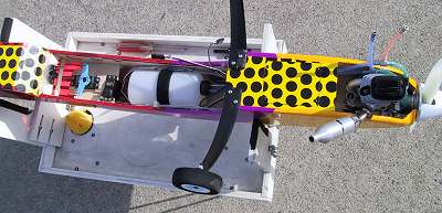 胴体内のメカの配置は御覧のとうりですが、後ろ重になるのでエンジンとメインギヤの間にハッチを作って受信機とバッテリーを積みましたがそれでも指定重心位置より15mm後ろになりました。もっともそれほどには飛ばした感じで違和感はありませんでした(翼弦が広いので許容範囲がひろいようです) |