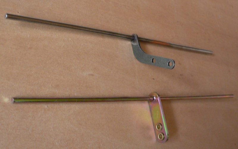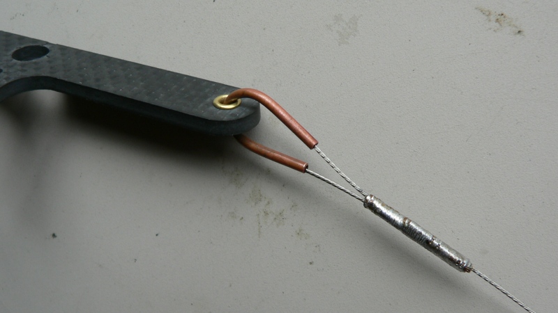 ベルクランクのリードアウトワイヤーの取り付け。 いろいろな方法が有るようですが銅管を使うことにします。ラジコンで使うワイヤーリンケージのパーツの余りにちょうどよさそうな銅パイプを見つけたので。パイプを炙ってなめして柔らかくしてワイヤーを通してドライバーに巻きつけるときれいなRが出来ました。 |