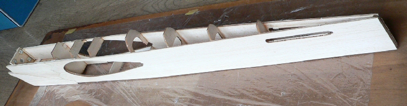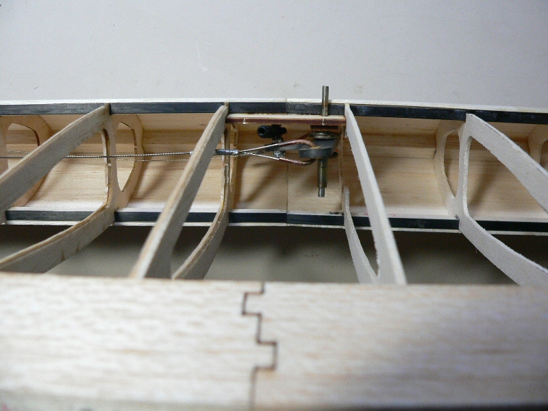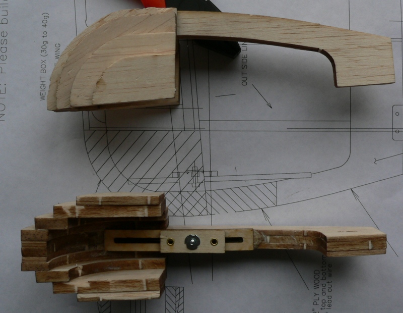リブに貼り付ける面とスパーの位置を合わせると良いでしょう。可動式のリードアウトガイドはバルサの粉と瞬間低年度で固定。 |